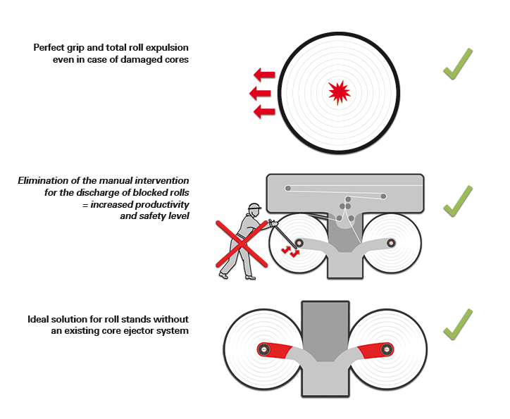 Das neue Duplex-System von Renova kombiniert einen mechanischen Spannkopf mit einem teleskopischen Auswurfzylinder. Dabei bietet ein mechanischer Spannkopf den sicheren Halt für Ihre Papierrollen. Mit Hilfe des teleskopischen Pneumatik-Auswurfzylinders werden auch blockierte Papierhülsen immer gleichmäßig und sicher entfernt.